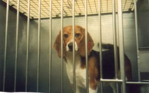 Cane beagle all’interno dei laboratori di Envigo, Inghilterra