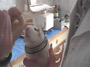 Una cavia stretta in un tubo contenitivo alla quale sta per essere eseguito un test all’interno di un laboratorio inglese